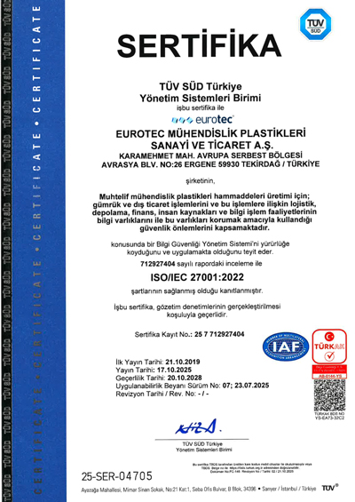 eurotecMühendislik Plastikleri Sanayi ve Ticaret A.Ş. olarak vizyon, misyon, ilke ve değerlerimiz doğrultusunda oluşturduğumuz Bilgi Güvenliği Yönetim Sistemi ile sürdürülebilir kalkınmaya katkıda bulunmayı ve sektörümüzde en saygın olmayı amaçlıyoruz.