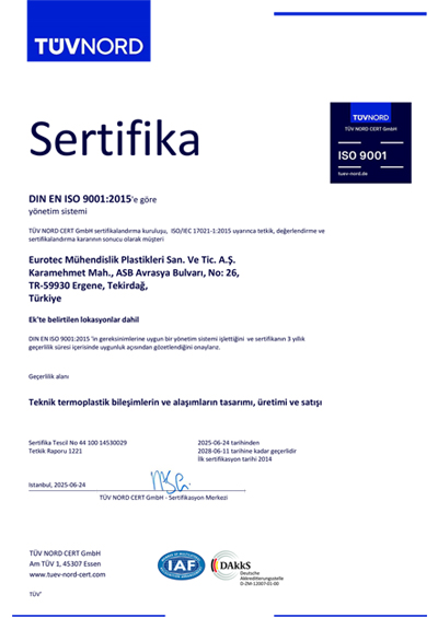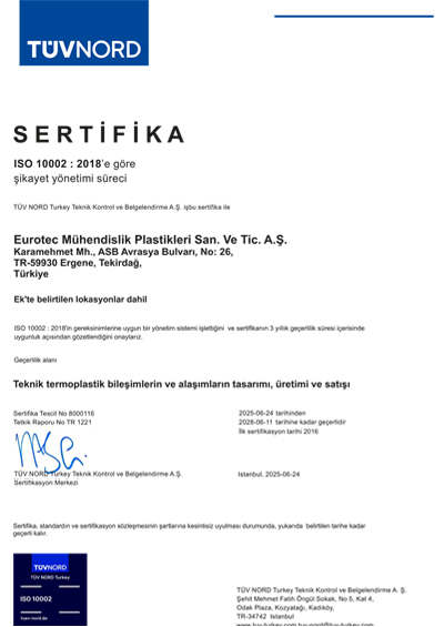 eurotecMühendislik Plastikleri Sanayi ve Ticaret A.Ş. olarak vizyon, misyon, ilke ve değerlerimiz doğrultusunda oluşturduğumuz Müşteri Memnuniyeti Yönetim Sistemi ile sürdürülebilir kalkınmaya katkıda bulunmayı ve sektörümüzde en saygın olmayı amaçlıyoruz.